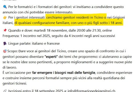 https://www.formazionedeigenitori.ch/it cerca genitori ticinesi per il Gruppo Genitori Insieme. Iscrizioni ancora possibili.