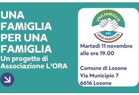 Il Comune di Losone, in collaborazione con l’Associazione L’ORA, vi invita alla presentazione del progetto “Una famiglia per una famiglia”, che si terrà: 📅