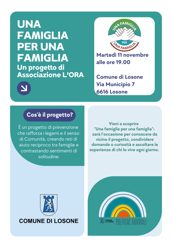 Il Comune di Losone, in collaborazione con l’Associazione L’ORA, vi invita alla presentazione del progetto “Una famiglia per una famiglia”, che si terrà: